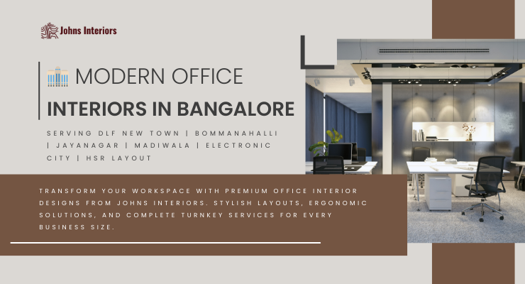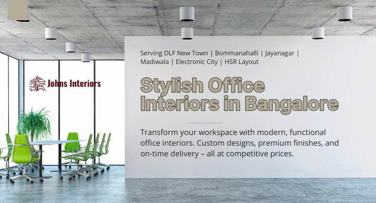 Transform your workspace with premium office interiors in Bangalore. Serving DLF New Town, Bommanahalli, Jayanagar, Madiwala, Electronic City & HSR Layout. Modern designs, ergonomic solutions & professional execution. Book your consultation today!