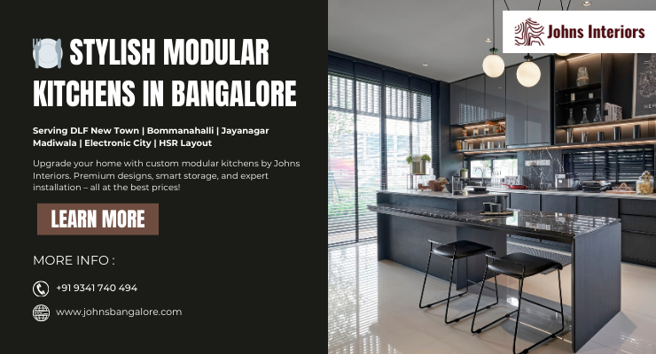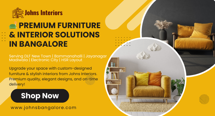 Premium furniture and interior solutions in Bangalore by Johns Interiors. Serving DLF New Town, Bommanahalli, Jayanagar, Madiwala, Electronic City & HSR Layout. Custom designs, luxury furniture & complete interiors. Book a free consultation today!